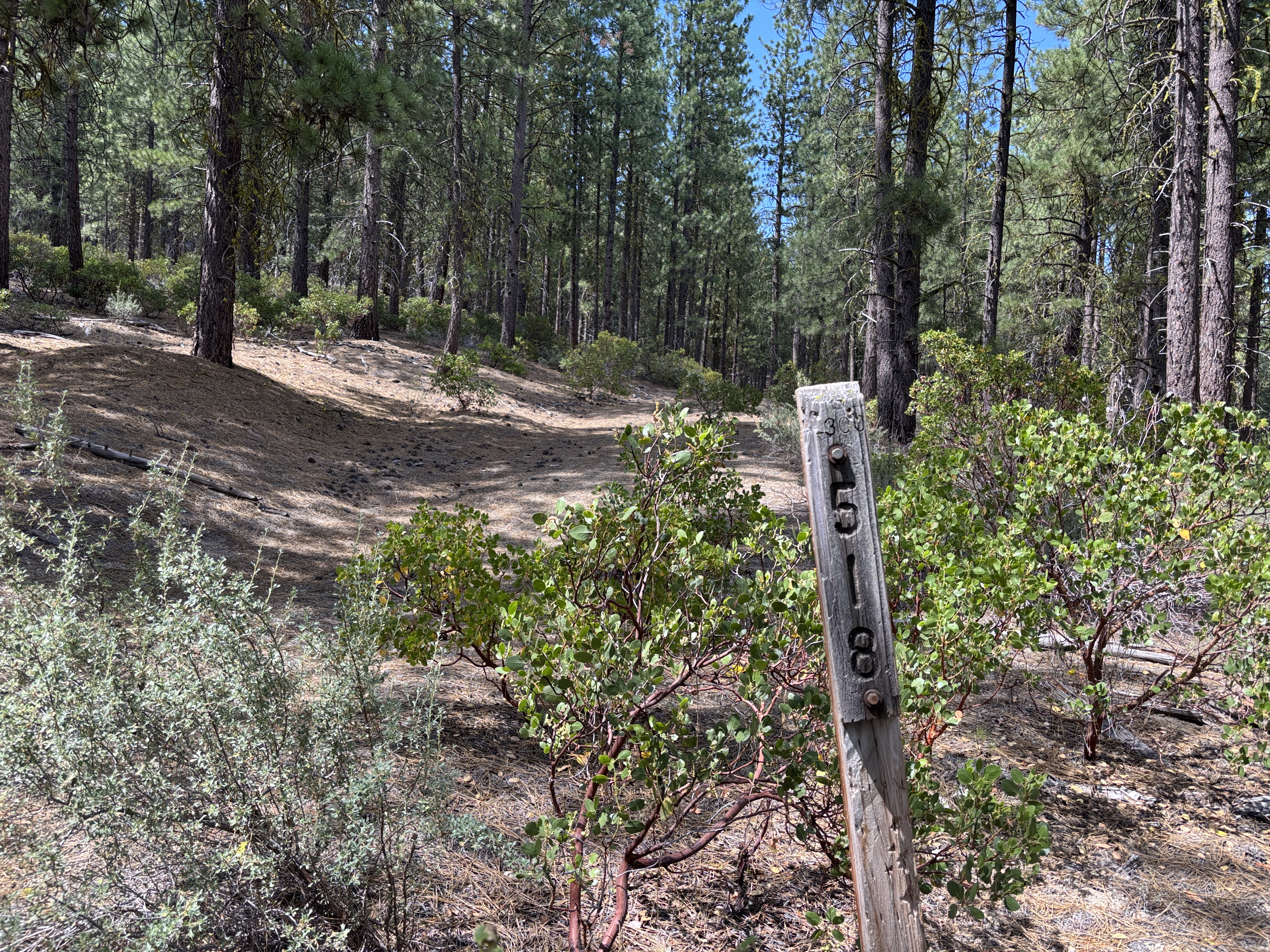 I saw an old signpost for FR-518. I went cross county avoiding the first looping switchback because there was no undergrowth and no bushwhack needed. When I intersected the abandoned road bed I followed it up to the summit avoiding the need for any bushwhacking through the manzanita undergrowth.