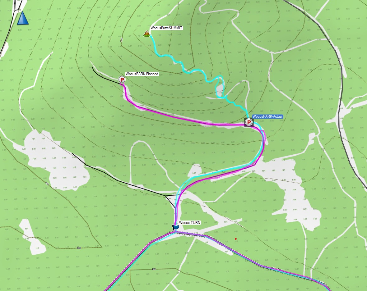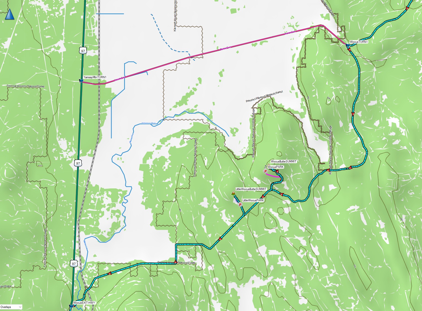 Access to Wocus and Little Wocus are off of Kirk Road. I drove from Yamsay Mtn so was driving SW on Kirk to make a loop. For Wocus, turn off of Kirk at 42.805317, -121.688200. For my activation I found an abandoned forest road that was hikable. I parked at 42.812600, -121.681117. See image below.