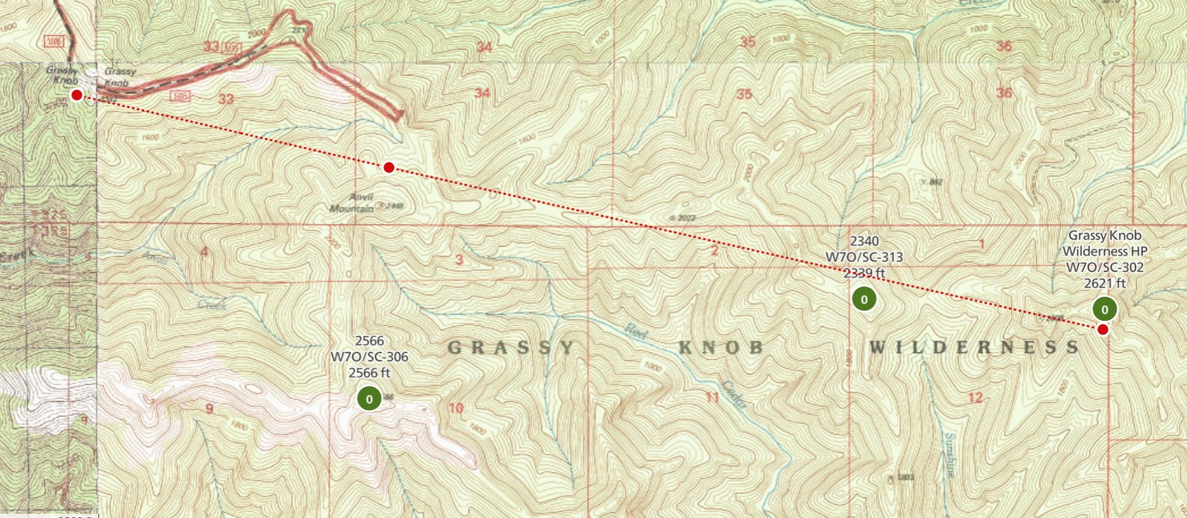 The "easy to reach" Grassy Knob near Port Orford, Oregon is not a summit. Elevation: 2,342'  Rise: 442' While the Grassy Knob Wilderness HP about four miles east is W7O/SC-302 and looks like a daunting wilderness bushwhack. Elevation: 2,620'  Rise: 880'