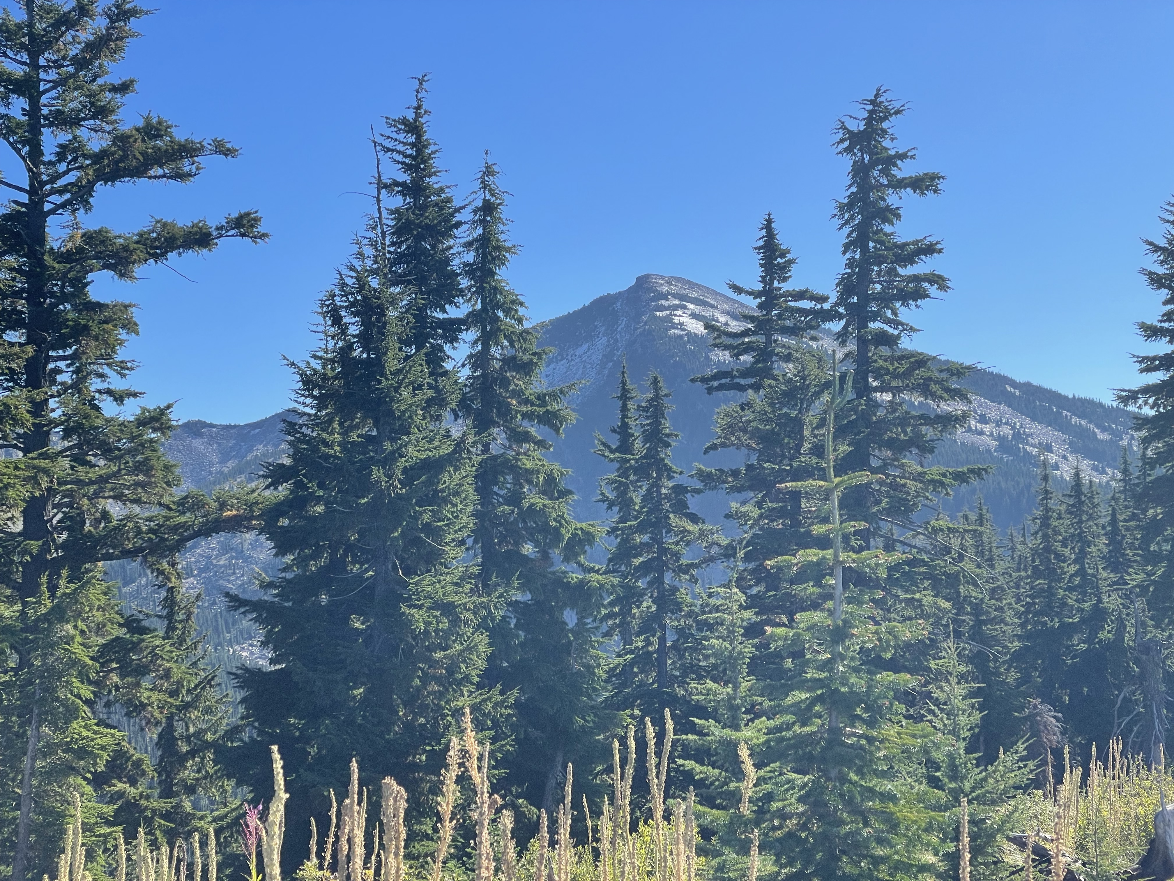 The trail climbs initially through old timber harvest units of densely regenerated young mature forest intersecting or following several old logging roads or skid trails. Soon however the trail enters older forest of mostly mountain hemlock well-spaced with an understory of shrubs dominated by tall black huckleberry, current and Rhododendron menziesia. The trail intersects the less steep main ridge and the Wilderness boundary at about 1.3 miles. Further along this ridge the trail drops into a more recent wildland fire. After dropping 0.5 miles through this old wildland fire and a short section of old forest the trail steepens up the last 1300’ of elevation gain to the summit over a well-defined switch-backing trail in mostly large boulders and talus.