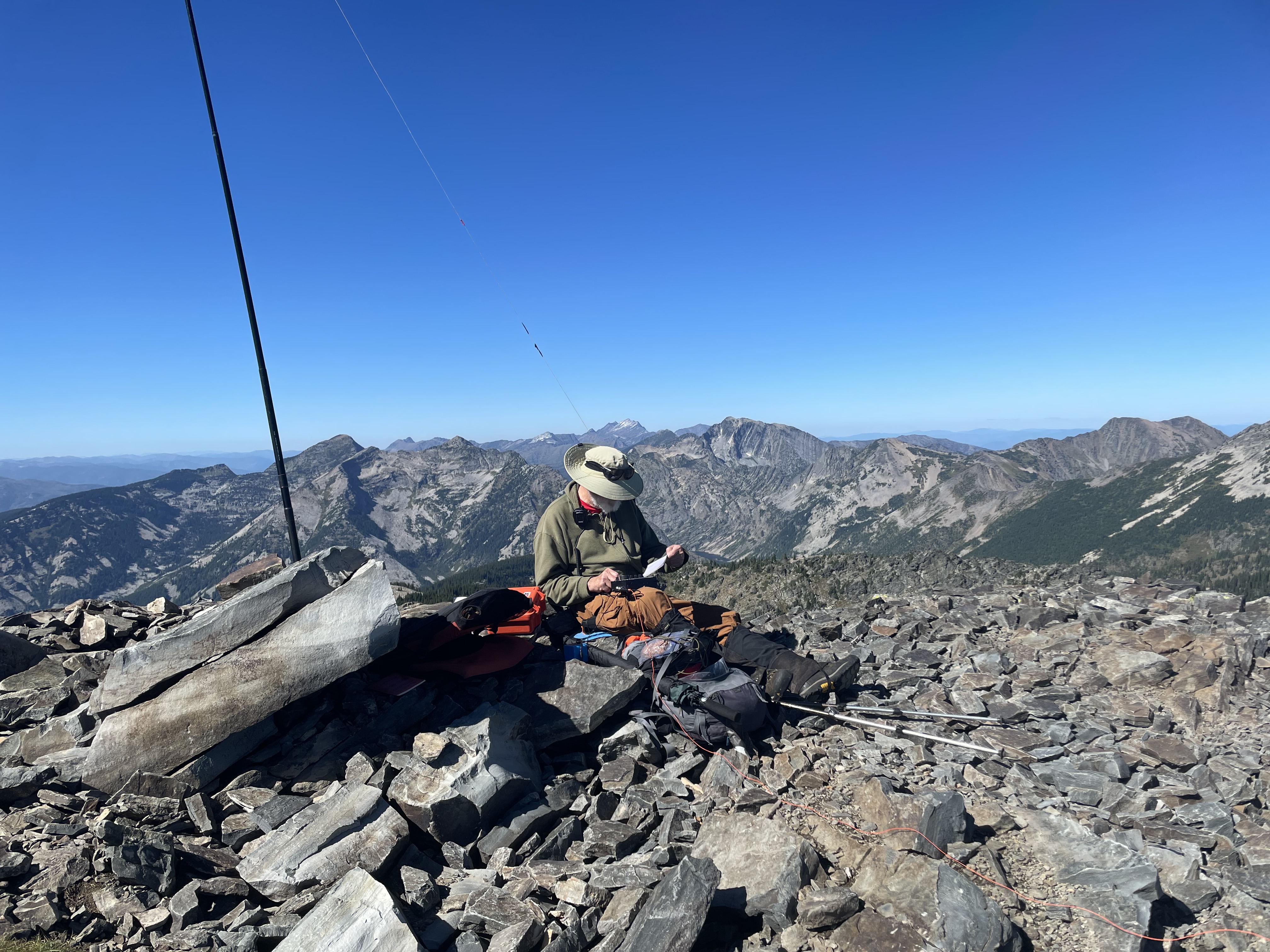 Engle Peak summit is exposed with bedrock and large loose rock piles suitable for supporting antenna poles.