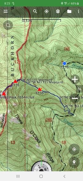 I started a 1145, and Backcountry Navigator logged it as 4.5 hours including over an hour on the summit, with about 1900 vertical feet. Plenty of parking at a large turnout--commonly used by folks for camping or campfires. Follow the ridge up well defined elk trails to another logging landing. With the right vehicle, one could drive to this upper landing (not with a Prius, I tried). Then continue to follow an elk path up. The area was logged long ago, so it has grown up enought that climbing is not hampered much by brush or such. Above the landing it becomes old grown and more open. The elk path peters out, but the ridge remains easy to follow. There are a few minor ups and downs over rocks. One can stay in the trees on either side of the ridge, or scramble up the rocks/snow where there are great views and spots to rest. I didn't encounter snow until about 4000 feet elevation. It was fairly consolidated, so I only sunk in 6-12 inches. Until about 4700 feet. Then I sunk in well over my knees, and I couldn't make it straight up, but had to do a bit of traversing at an angle. This only lasted about 200 feet vertical, then I made my way to the south, just below the summit. The more southerly aspect had more consolidated snow, which was easy to climb. The summit has a few trees that can be used to string up an antenna.